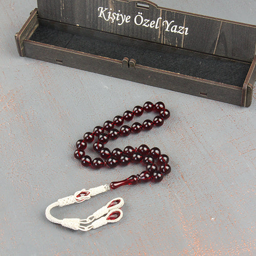 مسبحة كهرمانية حمراء وسوداء مع شرابات فضية ومكتوبة في صندوق مخصص