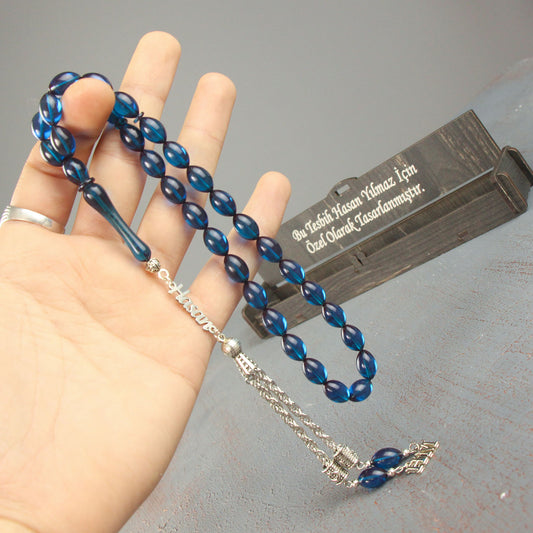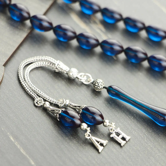 سبحة صلاة مخصصة للاسم الفضي مع حروف كهرمانية زرقاء اللون