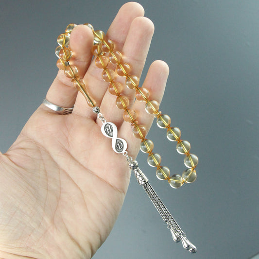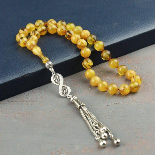 مسبحة صلاة باللون الأصفر إنفينيتي باللون الفضي مخصصة بأحرف كهرمانية