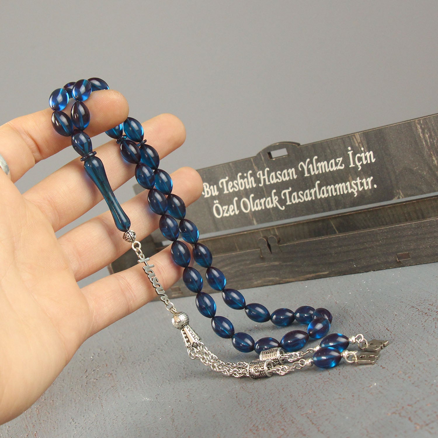 سبحة صلاة مخصصة للاسم الفضي مع حروف كهرمانية زرقاء اللون