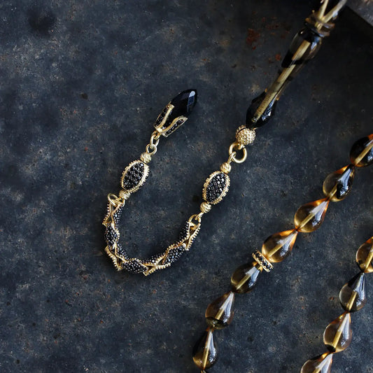 Siyah Damla Kesim Gümüş Püsküllü Kehribar Tesbih - Kişiye Özel Zarif Tasarım