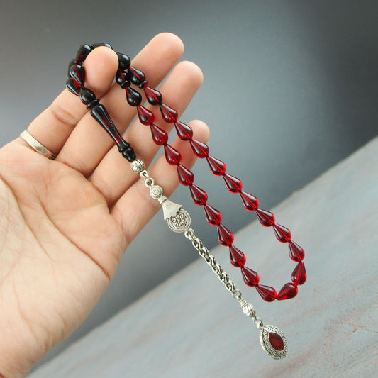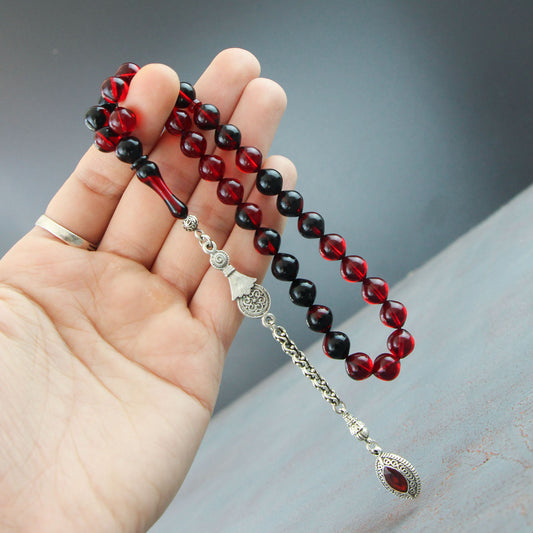 Kalemkar Serisi Gümüş Kazaz Püsküllü Kırmızı Siyah Ateş Kehribar Tesbih