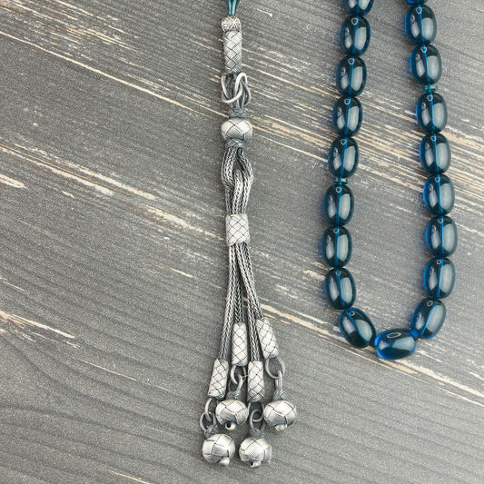 Fatih Serisi Gümüş Kazaz Püsküllü Mavi Ateş Kehribar Tesbih