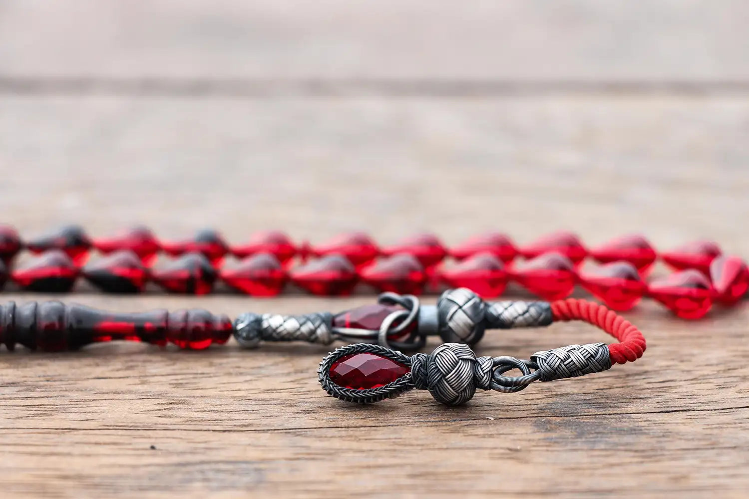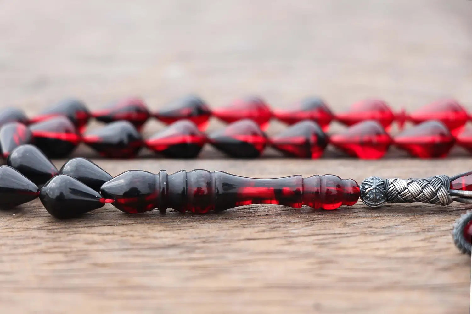 Damla Kesim Gümüş Püsküllü Renk Süzmesi Kırmızı Siyah Ateş Kehribar Tesbih
