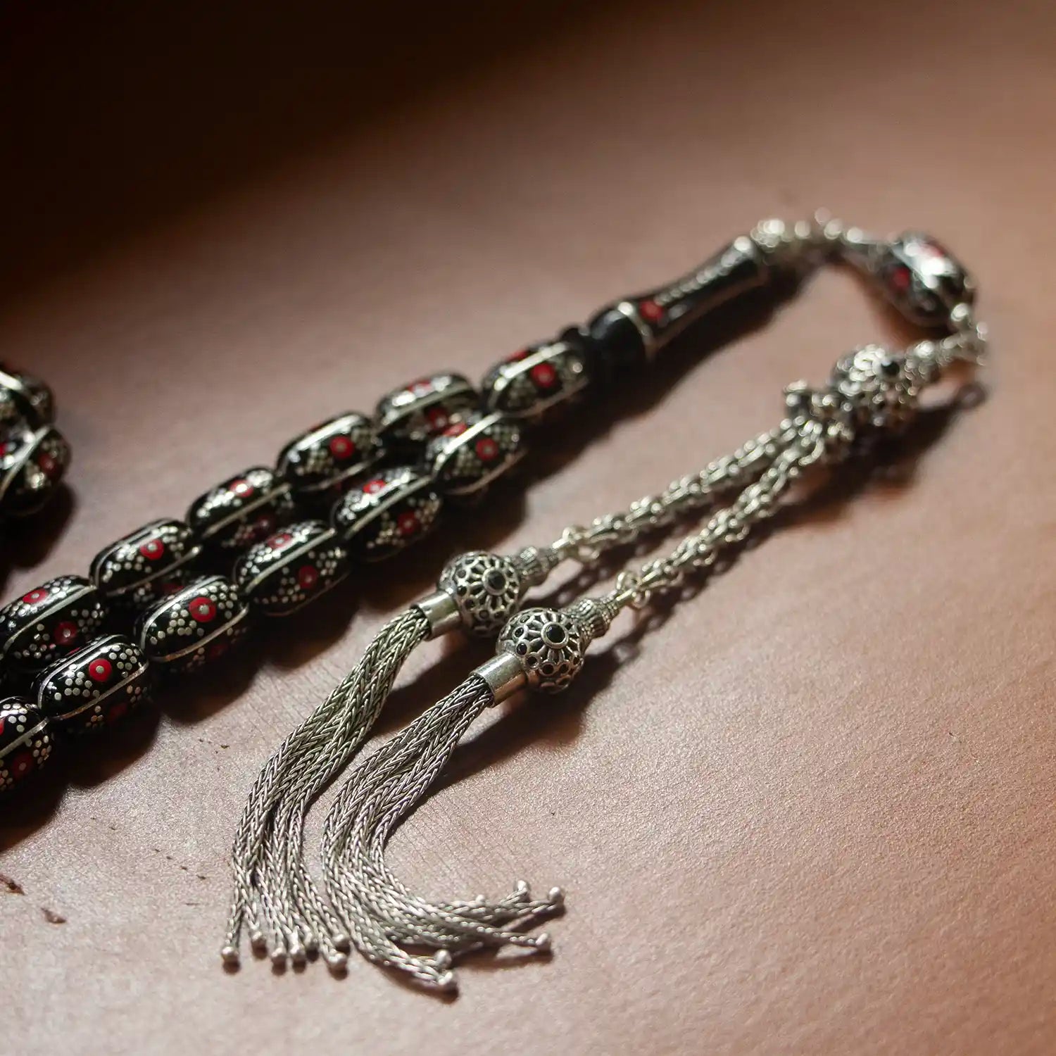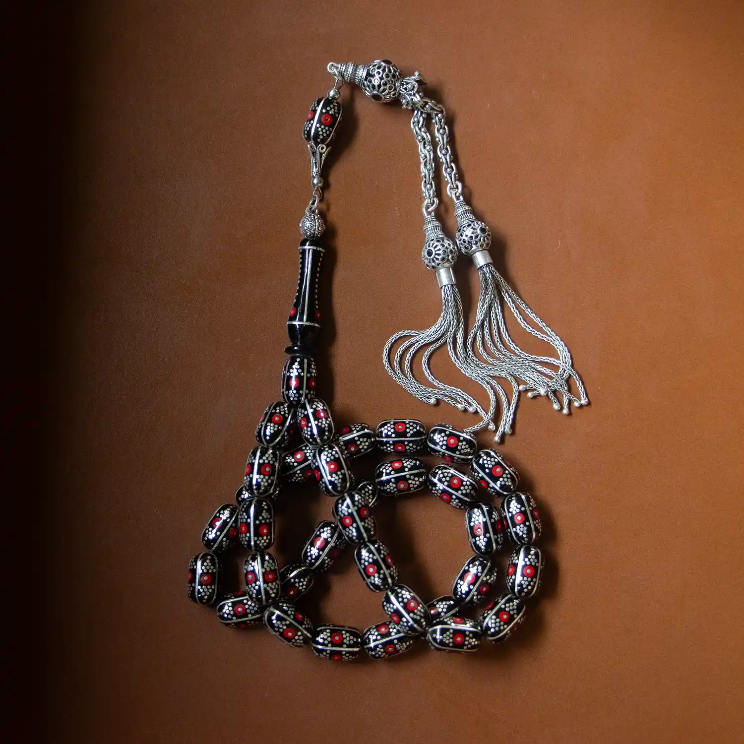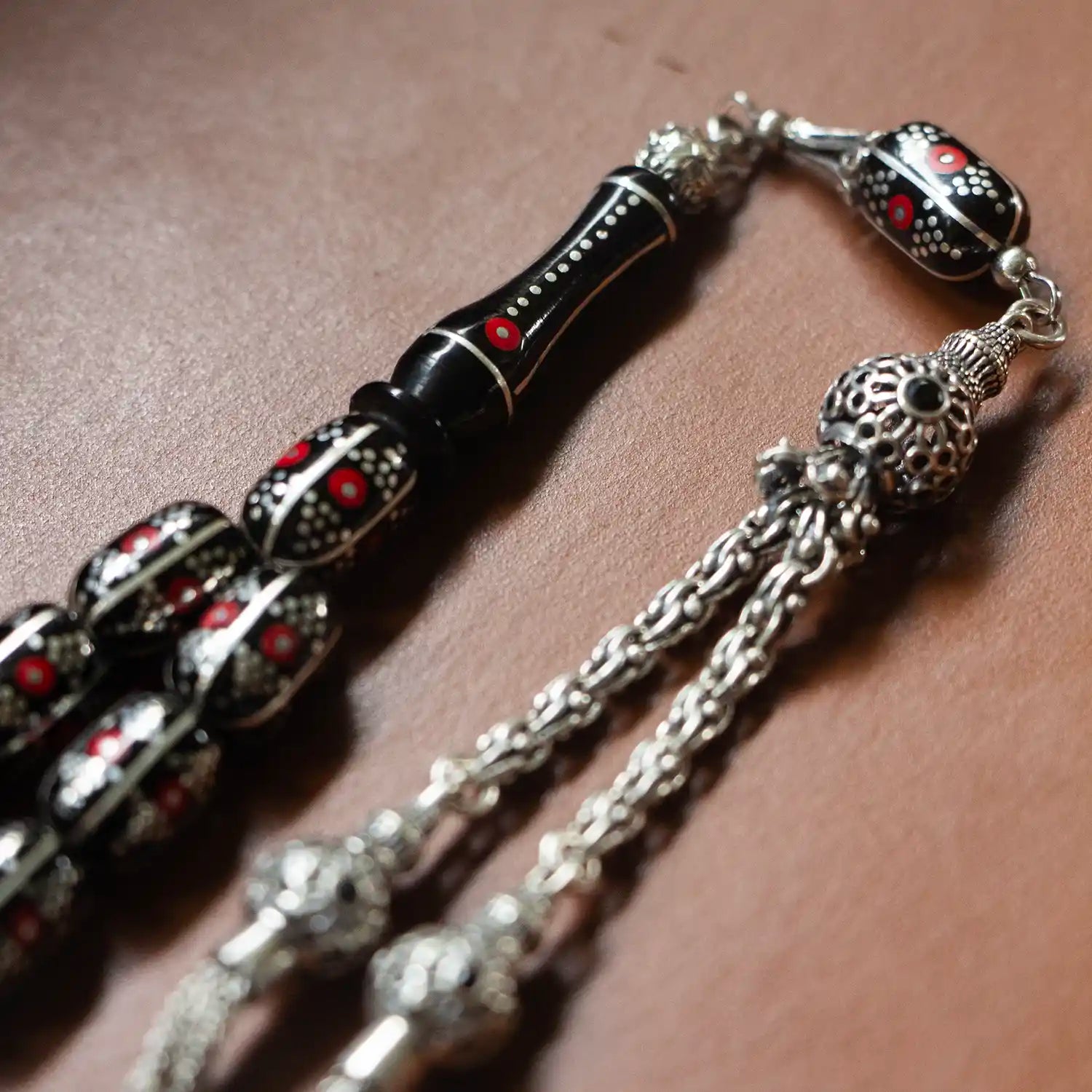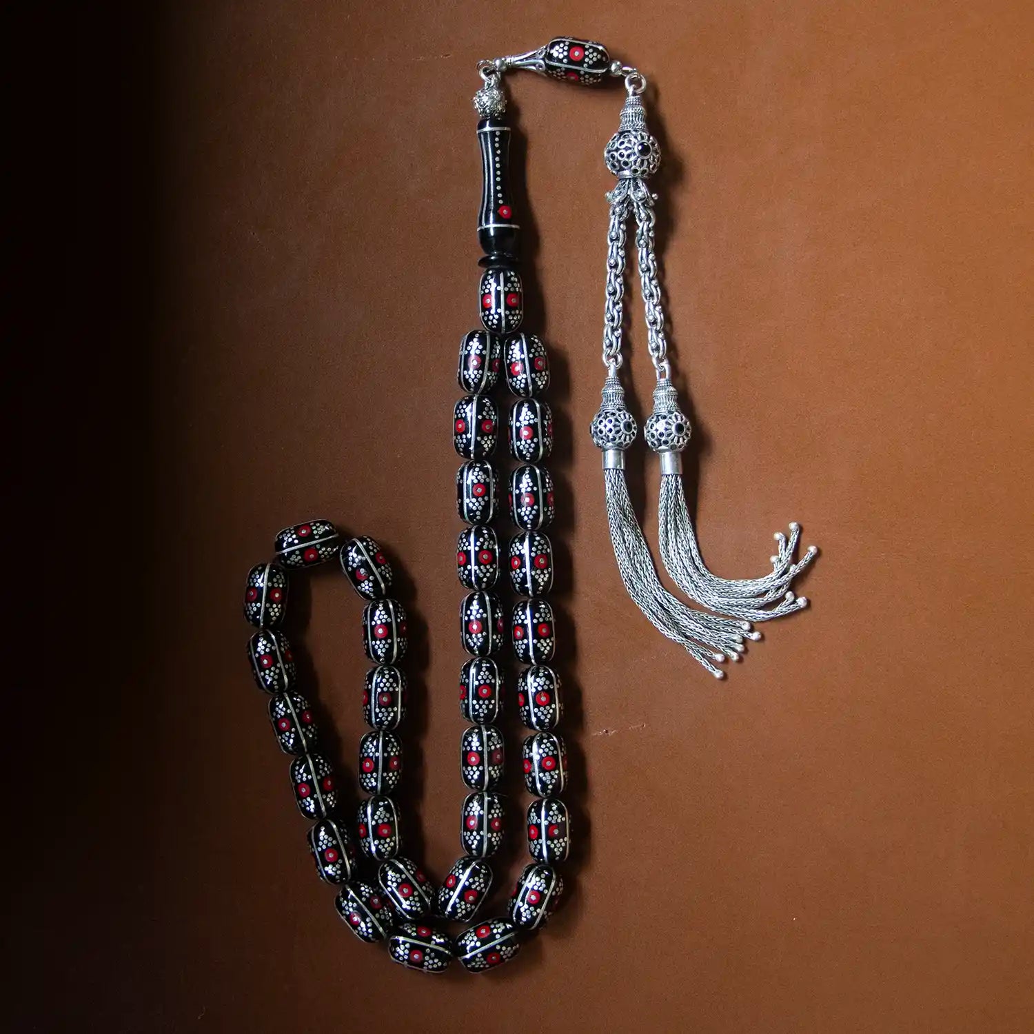Her tanesi doğal Erzurum oltu taşından yapılmış olup, üzerinde yer alan yoğun el işçiliği gümüş işlemeler tesbihin estetik değerini artırmaktadır.