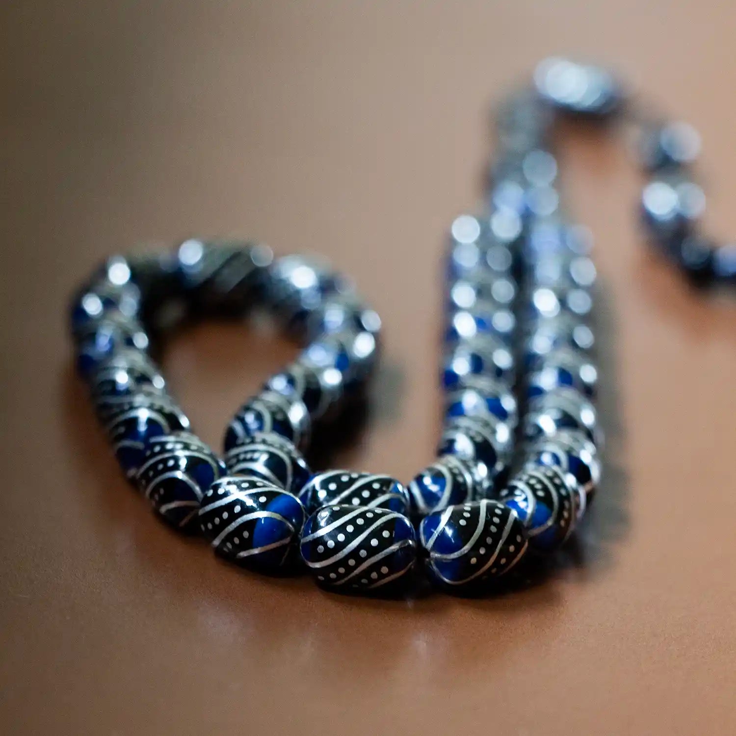 Her bir tanesi doğal Erzurum oltu taşından üretilmiş, yüzeyine el işçiliğiyle işlenen gümüş çakım desenleri zarif mavi detaylarla tamamlanmıştır.